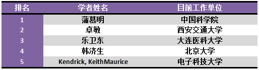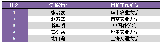 其中中科院院士、清华大学教授施一公为“生化,遗传和分子生物学”领域第一人;中科院院士、国际著名的神经生物学专家蒲慕明教授为“神经科学”领域第一人;中科院院士、华中农业大学教授张启发为“农业与生物科学”领域第一人。
