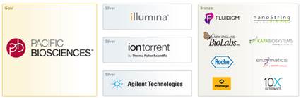 本次研讨会汇集了以Pacific Biosciencellumina的金牌赞助商,illumina公司、赛默飞世尔公司的iontorrent®、安捷伦科技的银牌赞助商以及Roche等8家银牌赞助商的参与。其中8家银牌赞助商还额外组成了一个研讨会,会议上JP摩根大会上冲出的黑马--10X Genomics再次引起了与会者的关注。