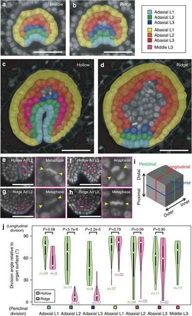 Abstract Complex morphology is an evolutionary outcome of phenotypic diversification. In some carnivorous plants, the ancestral planar leaf has been modified to form a pitcher shape. However, how leaf development was altered during evolution remains unknown. Here we show that the pitcher leaves of Sarracenia purpurea develop through cell division patterns of adaxial tissues that are distinct from those in bifacial and peltate leaves, subsequent to standard expression of adaxial and abaxial marker genes. Differences in the orientation of cell divisions in the adaxial domain cause bifacial growth in the distal region and adaxial ridge protrusion in the middle region. These different growth patterns establish pitcher morphology. A computer simulation suggests that the cell division plane is critical for the pitcher morphogenesis. Our results imply that tissue-specific changes in the orientation of cell division underlie the development of a morphologically complex leaf.