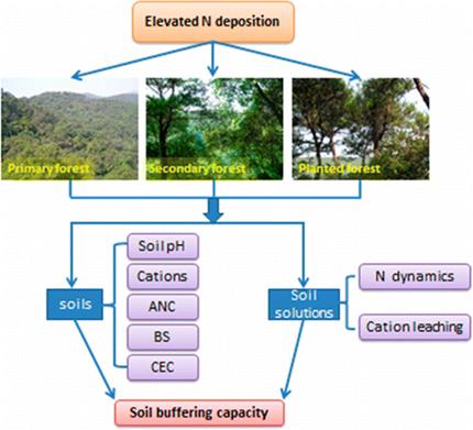 针对氮沉降全球化的背景,华南植物园生态系统管理研究组副研究员鲁显楷、博士生毛庆功、研究员莫江明等人选取中国南方典型的三种森林生态系统:原始(或成熟林)、次生林和人工林,探讨了不同土地利用历史的生态系统土壤缓冲能力对长期氮沉降的响应。