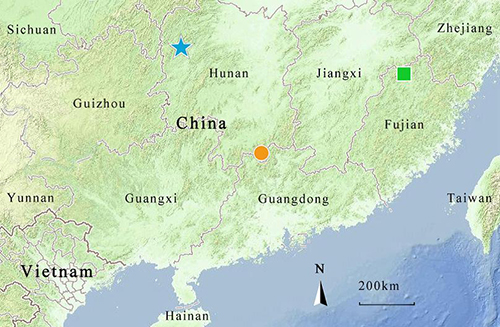 赵氏后棱蛇Opisthotropis zhaoermii(五角星)、莽山后棱蛇O. cheni(方块)与山溪后棱蛇O. latouchii(圆圈)的模式产地情况