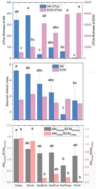 图 2 次生演替过程中土壤丛枝菌根(AM)和外生菌根(ECM)真菌群落的丰富度(上)、多样性(中)和AMF / ECM多样性比值(下)