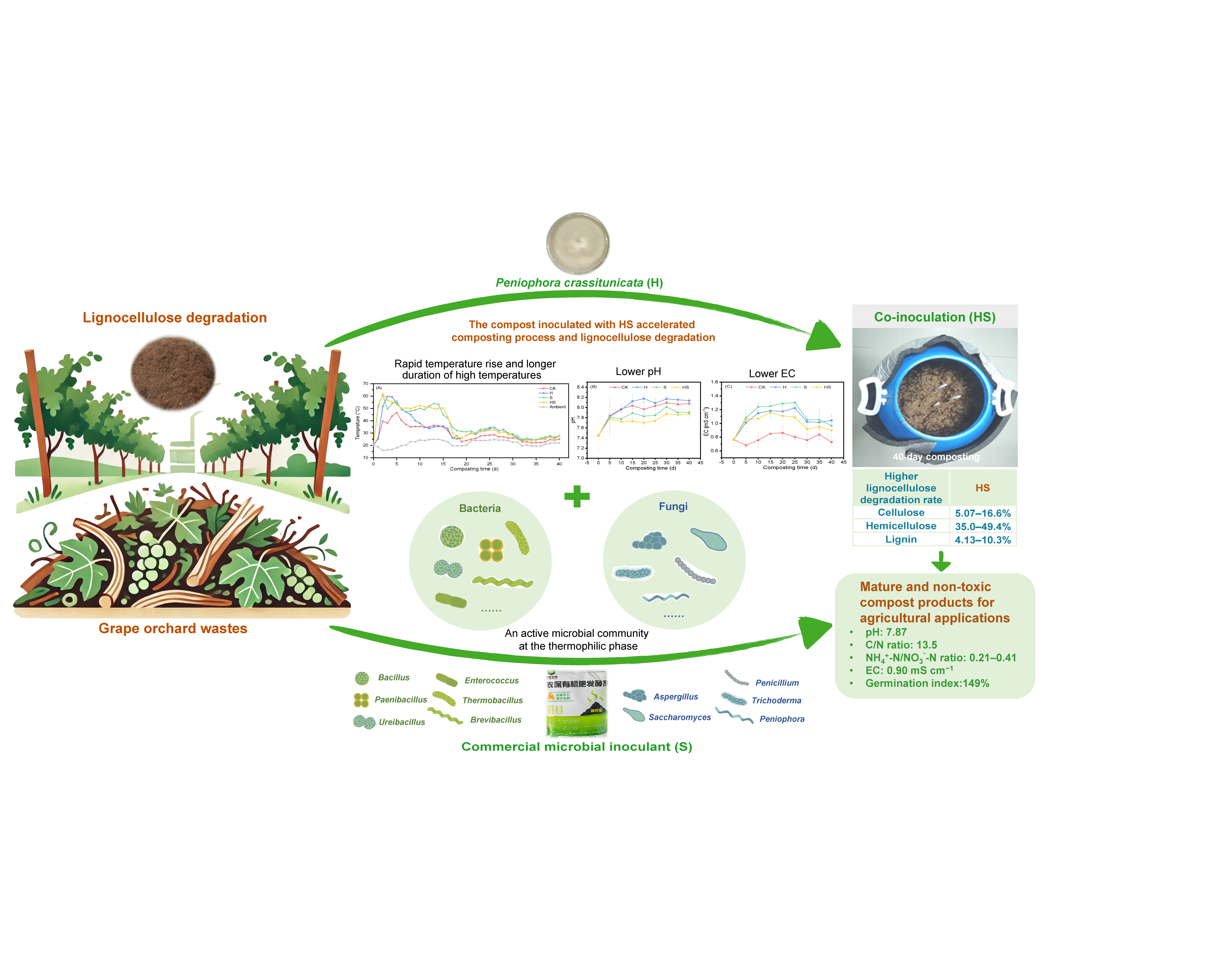 隔孢伏革菌(Peniophora)已被广泛分离,且被证明具有高产漆酶等特性,已有研究证明其可高效降解杨树木质素和森林凋落物纤维素成分,但有关果枝残余物堆肥的相关研究则鲜见报道。本研究利用课题组前期从凋落物分离的厚壁隔孢伏革菌(P. crassitunicata)HUA,开展堆肥试验,探讨隔孢伏革菌和/或商业菌剂接种对葡萄果枝残余物堆肥的影响及相关机制。研究发现:(1)堆肥过程中,隔孢伏革菌单独接种、隔孢伏革菌和商业菌剂复合接种均能显著促进木质纤维素降解、加快腐熟进程,且复合接种表现出更高的木质纤维素降解率和酶活性、升温更快、高温期更长(15天)、pH和电导率更低。(2)厚壁菌门(如Bacillus、Paenibacillus)和子囊菌门(如Aspergillus)以及拟杆菌门、放线菌门和担子菌门(如Peniophora)主导了堆肥微生物群落;接种隔孢伏革菌和商业菌剂丰富了耐热芽孢杆菌(Thermobacillus)、短芽孢杆菌(Brevibacillus)、肠球菌(Enterococcus)、木霉等微生物菌属;热解阶段,碳水化合物代谢主导了微生物代谢途径,接种隔孢伏革菌和商业菌剂塑造了活跃的堆肥微生物群落。(3)与商业微生物接种剂的联合接种有效加速了木质纤维素的降解和堆肥的成熟,40天后获得成熟度高且环境友好、无害的堆肥产品,可广泛应用于农业生产,为果园废弃物的资源化管理和农业生产提供了新策略。
