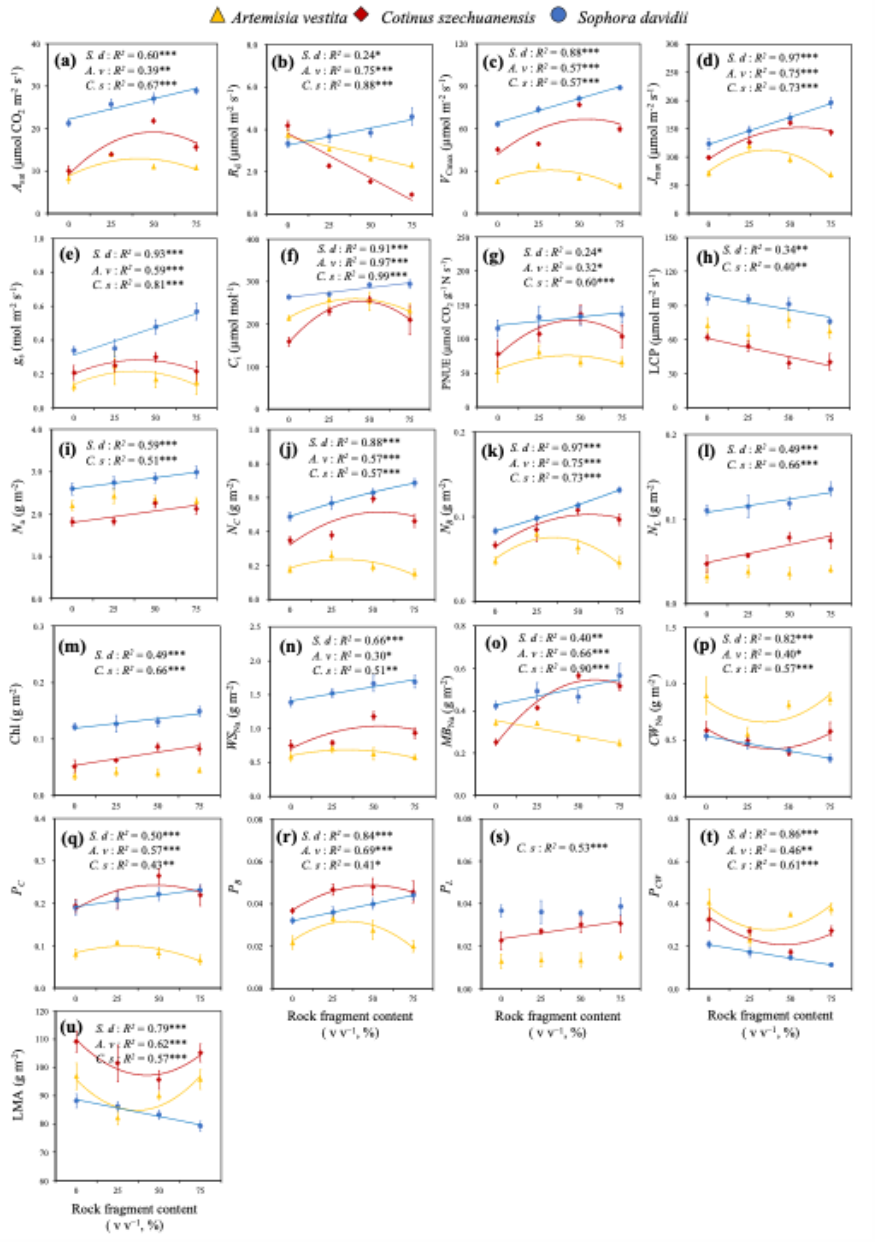 图1. 白刺花(S. davidii:蓝色圆圈)、四川黄栌(C. szechuanensis:红色菱形)和毛莲蒿(A. vestita:黄色三角形)叶功能性状对石砾含量的响应模式。叶片功能性状包括气体交换(a-h)、生理(i-p)、氮分配(q-t)及形态(u)性状。