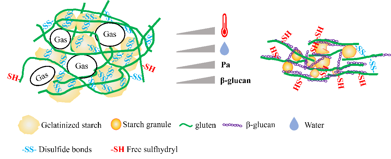 研究揭示,β-葡聚糖不仅可与淀粉和蛋白质直接结合,通过空间位阻效应抑制淀粉的糊化、消化及面筋蛋白中二硫键的形成,还会干扰面团的水合过程,从而阻碍面筋网络的有序构建。由于配方及制作工艺的差异,β-葡聚糖对面包和馒头面筋网络的抑制程度存在显著区别:在面包中,二硫键数量下降幅度较小,水合干扰程度较低,面团中结构略为松散、孔隙增大,面筋丝拉伸程度增加,但面筋丝之间仍具较好的弹性和连接性;而在馒头中,面筋丝明显增粗、弹性减弱,拉伸时呈现“撕裂”状态,接近断裂临界。