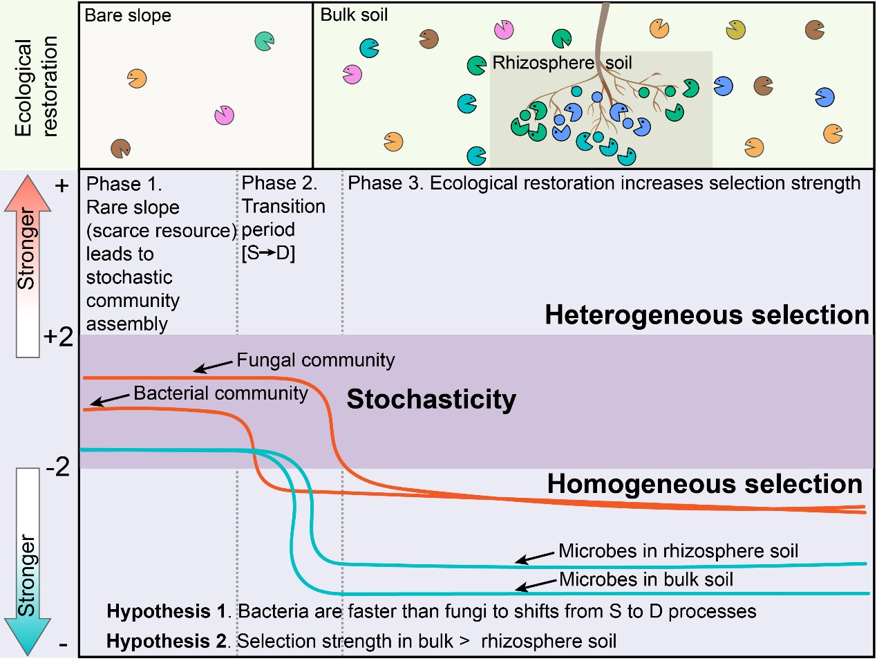 生态修复是应对工程活动引发的生态系统退化、提升生态系统多功能性的关键手段,尤其在生态脆弱、养分贫瘠的高寒地区具有重大意义。土壤微生物群落作为陆地生态系统的“隐形工程师”,在调控生物地球化学循环、植物—土壤反馈及生境稳定性方面发挥着不可替代的作用,是实现生态系统功能恢复的重要驱动力。尽管已有大量研究关注微生物多样性及其网络结构对生态系统功能的影响,但在生态恢复过程中,微生物群落的构建机制——即随机性过程(如生态漂变)与确定性过程(如环境过滤)的相对作用——仍不明确。