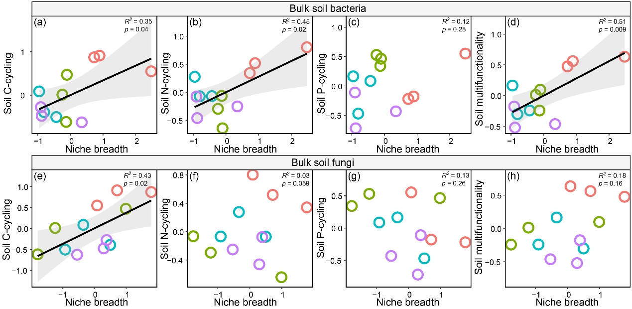 图3 非根际土壤中细菌(a-d)与真菌(e-h)生态位宽度同土壤碳、氮、磷循环及多功能性的线性回归
