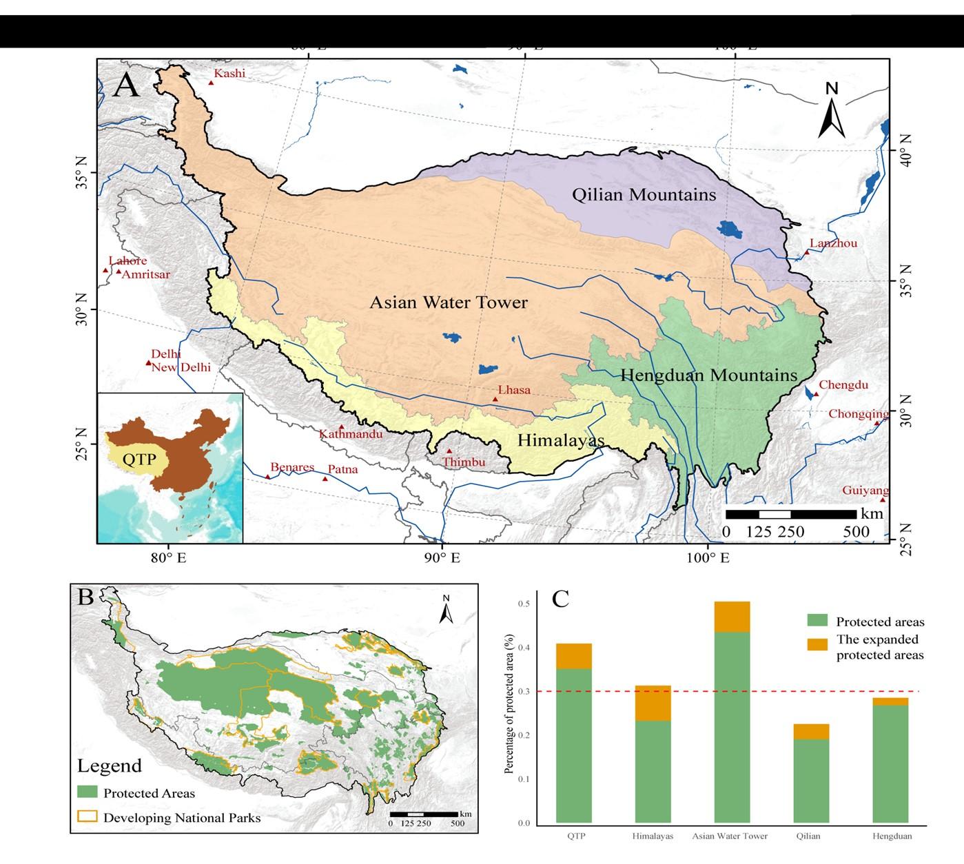 图1 研究区域及保护区系统分布。(A) 青藏高原研究区与生物地理分区;(B) 青藏高原范围内保护区及在建国家公园;(C) 各生物地理单元内现有保护区及扩展保护区(含在建国家公园)的面积占比。