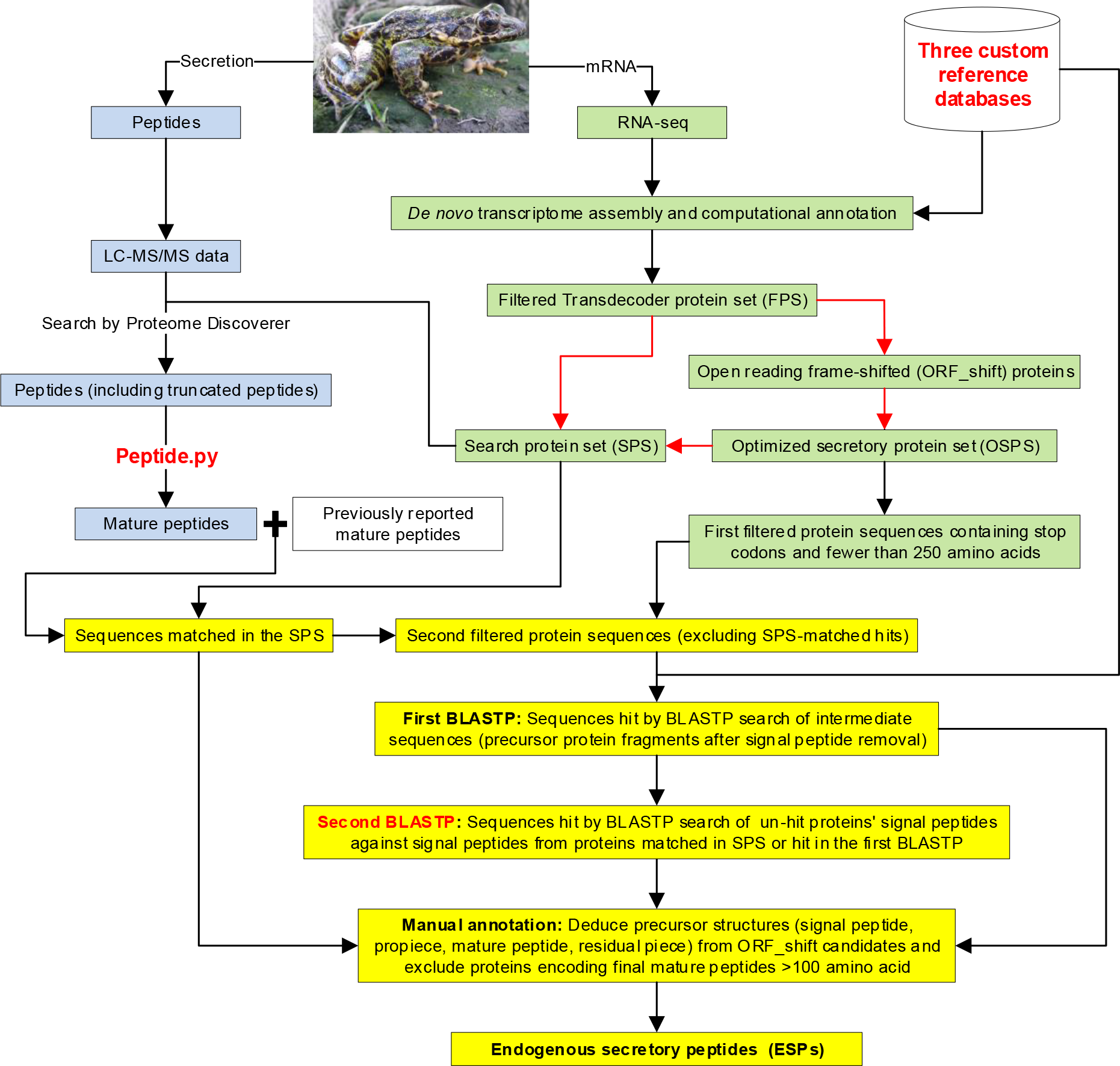 两栖动物皮肤富含内源性分泌肽(ESPs,Endogenous Secretory Proteins),在多种生理机能中发挥关键作用。然而,传统分离纯化与cDNA文库法难以全面获取内源性分泌肽,而常规无靶向转录组方法因信号肽预测假阴性而系统性遗漏大量候选序列,其根源在于起始密码子被误注释于5′非翻译区(5′-UTR),致使前体蛋白N端序列异常延长,从而引发信号肽预测失效。中国科学院成都生物研究所王斌团队创新开发了一种整合转录组学与肽组学的发现流程,有效纠正上述假阴性问题,将潜在内源性分泌蛋白鉴定效率提升61.6%。