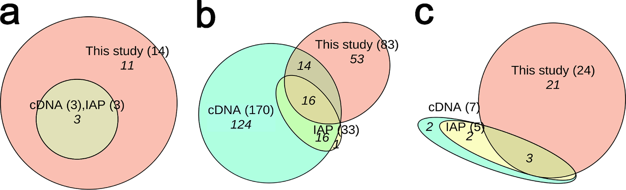 (a) ESP家族分类 (b) FSAP家族成员 (c) 非FSAP家族成员。IAP指分离纯化法,cDNA指cDNA法