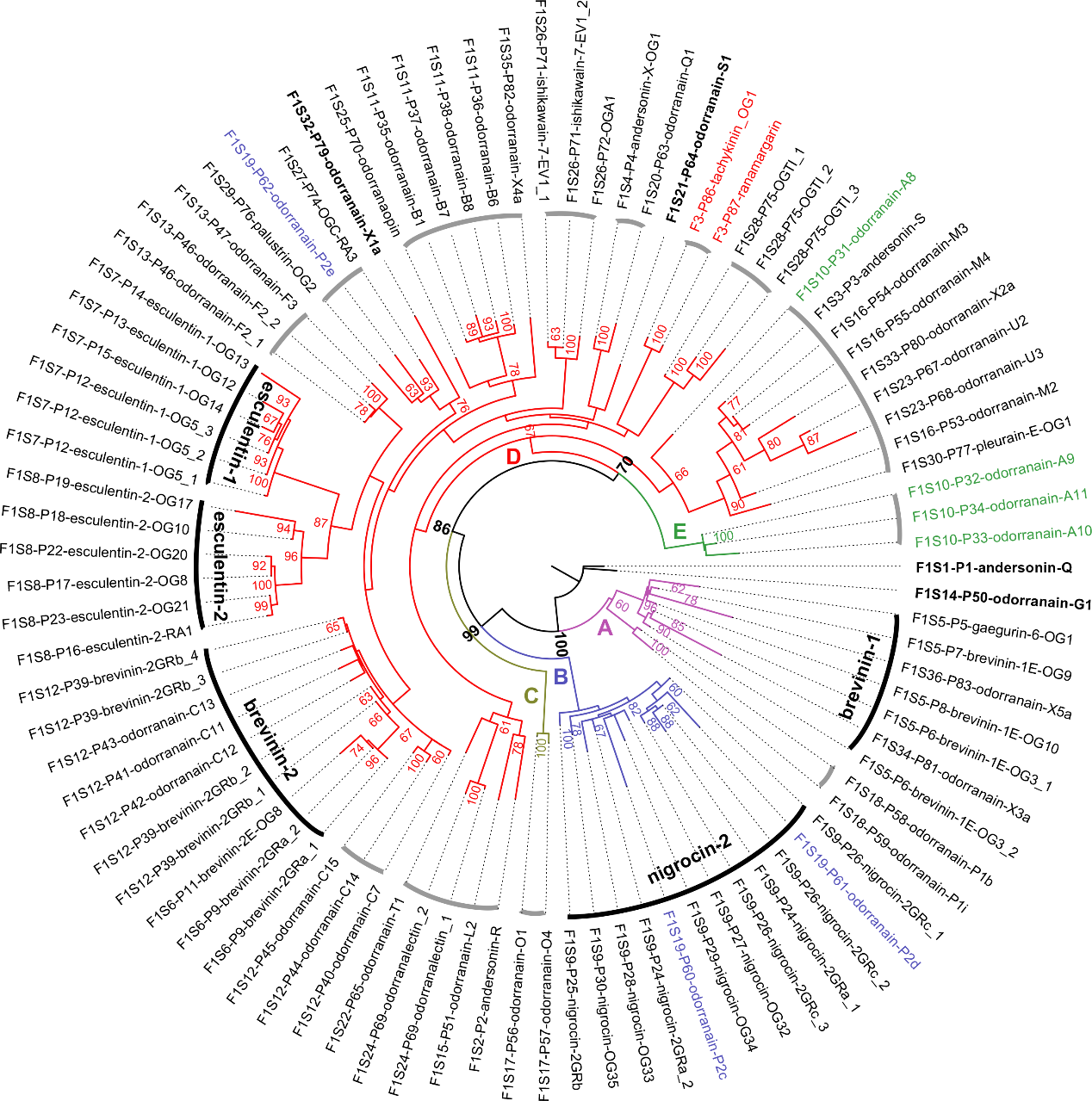 系统发育分析将FSAP成员划分为A-E五个进化枝,其中高变异的D枝包含多种非抗菌活性肽及两条与速激肽家族(tachykinin)趋同进化的肽(图3)。基于进化关系,本研究支持UniProt的蛋白家族分类标准,即将文献中激增的“无尾目特有抗菌肽家族”归并为少数家族(如FSAP、maximin-S、bombinin等)。