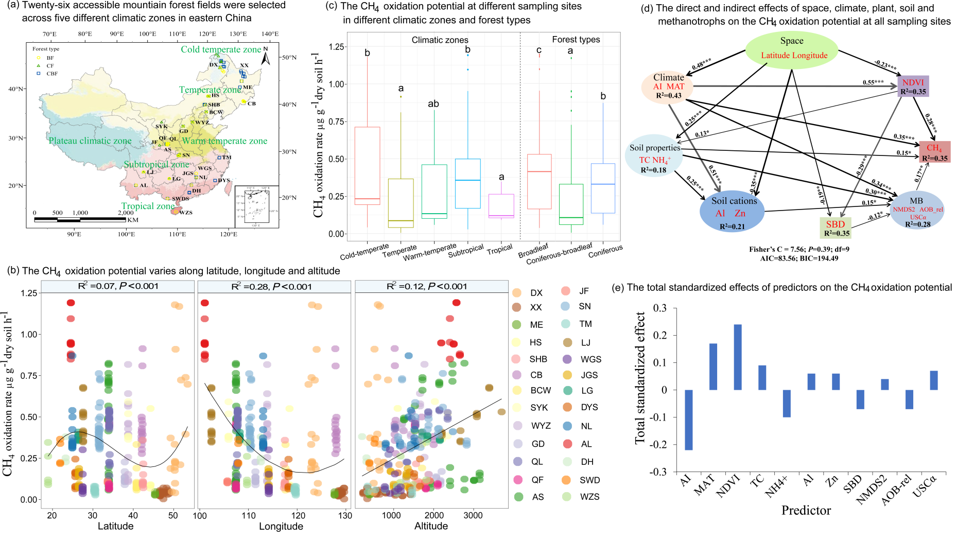 图1中国森林采样点的分布(a),CH4氧化潜力沿纬度、经度和海拔的变化(b)、不同气候带和森林类型间CH4氧化潜力的差异(c)、以及空间(经纬度和海拔)、气候、植物、土壤理化性质、土壤阳离子及甲烷氧化微生物群落多样性对CH4氧化潜力的直接和间接影响(d)和相对贡献(e)