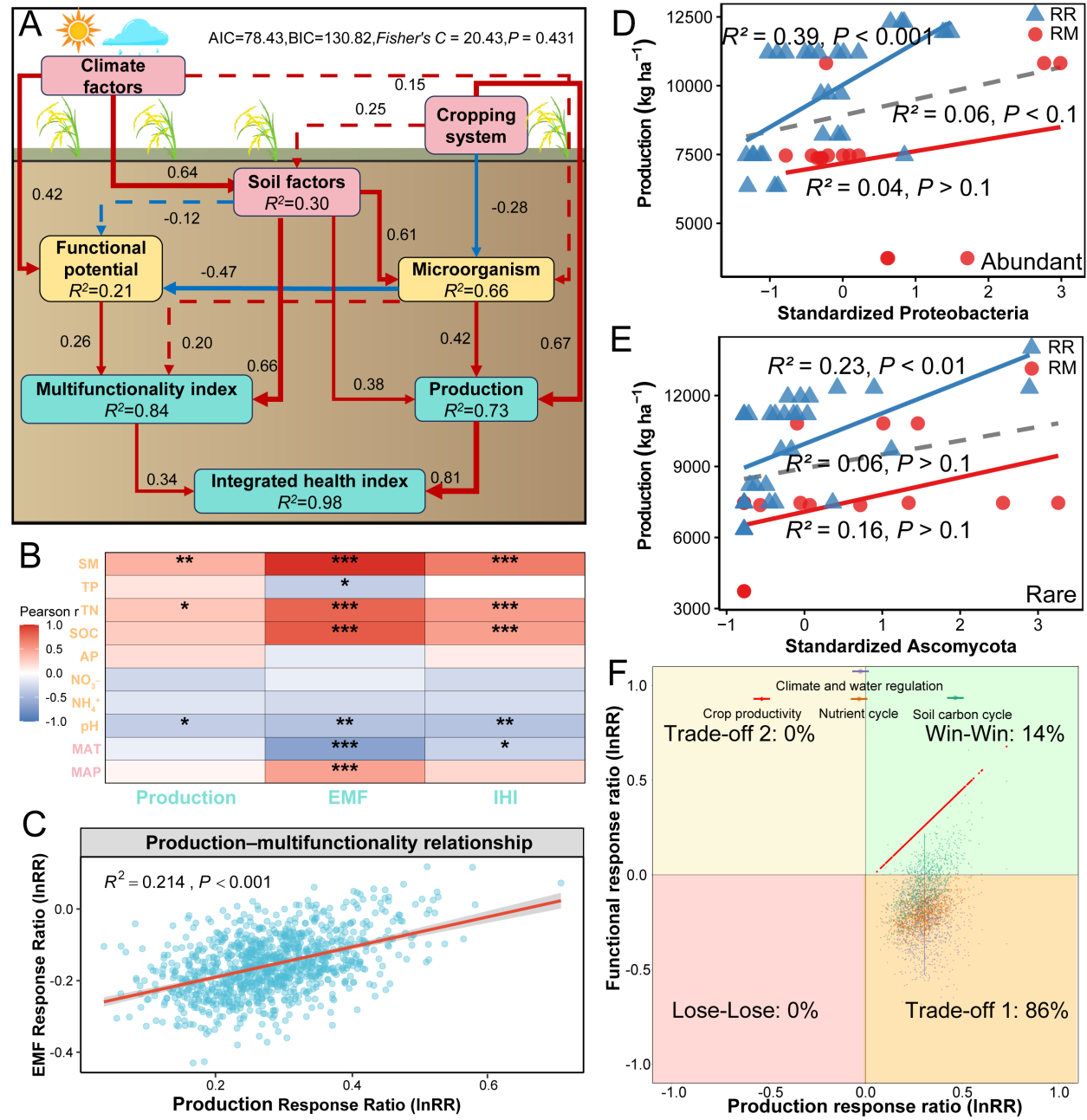 针对上述问题,中国科学院成都生物研究所退化土壤生态功能恢复创新团队博士研究生周军波(与西南大学联合培养)在庞学勇研究员指导下,系统研究了亚热带水稻轮作对土壤微生物群落组装、功能基因特征及产量与生态系统功能关系的影响。研究发现:(1)与单作系统相比,轮作显著提高了水稻产量,同时伴随着微生物群落组成的明显变化,群落组装过程趋向更强的确定性,微生物生态网络稳定性增强。(2)稀有微生物类群表现出较高的分类多样性,并对环境变化更加敏感,其中土壤有机碳是影响其分布的重要驱动因素。(3)多种与碳、氮、磷循环相关的关键功能基因及核心微生物类群与水稻产量呈显著正相关关系。(4)尽管轮作提高了水稻产量,但在多数样点中,生态系统多功能性呈下降趋势,表明产量提升与生态功能维持之间仍可能存在权衡关系,但这种权衡并非固定不变。综上所述,作物轮作通过重塑稻田土壤微生物群落的构建过程和功能特征,影响水稻产量与生态系统功能之间的关系。该研究不仅揭示了轮作调控微生物群落及关键功能基因的机制,也深化了对农业管理如何兼顾产量提升与生态功能维持的理解,为亚热带稻田可持续管理提供了科学依据。