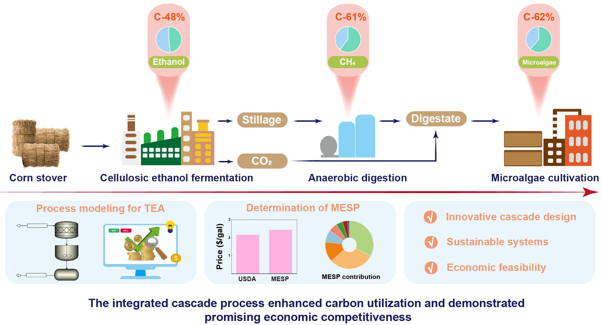 为破解这一难题,中国科学院成都生物研究所生物质废弃物资源化利用创新团队的敖天杰博士,与上海交通大学刘晨光教授、白凤武教授团队合作,取得重要进展。该研究创新提出木质纤维素生物质碳资源的梯级利用路线,构建了“纤维素乙醇发酵—厌氧消化乙醇废醪液—沼液耦合乙醇尾气培养微藻”的三位一体集成梯级工艺,实现木质纤维素碳资源的全链条捕获与高值化转化。在该闭环系统中,研究人员首先利用代谢工程改造的酿酒酵母,对预处理后的玉米秸秆水解液进行高效混合糖发酵,有效突破了传统菌株难以利用戊糖的技术瓶颈;随后,将发酵产生的乙醇废醪液(含残留有机物)进行厌氧消化制取甲烷,实现残留碳资源的二次回收;最终,以厌氧消化产生的沼液与乙醇发酵过程中捕获的二氧化碳共同作为微藻培养基质,在完成碳的生物固定的同时,实现营养物质的循环利用。通过这一集成梯级工艺,以玉米秸秆为代表的木质纤维素类生物质碳利用率从传统工艺的48%显著提升至62%。