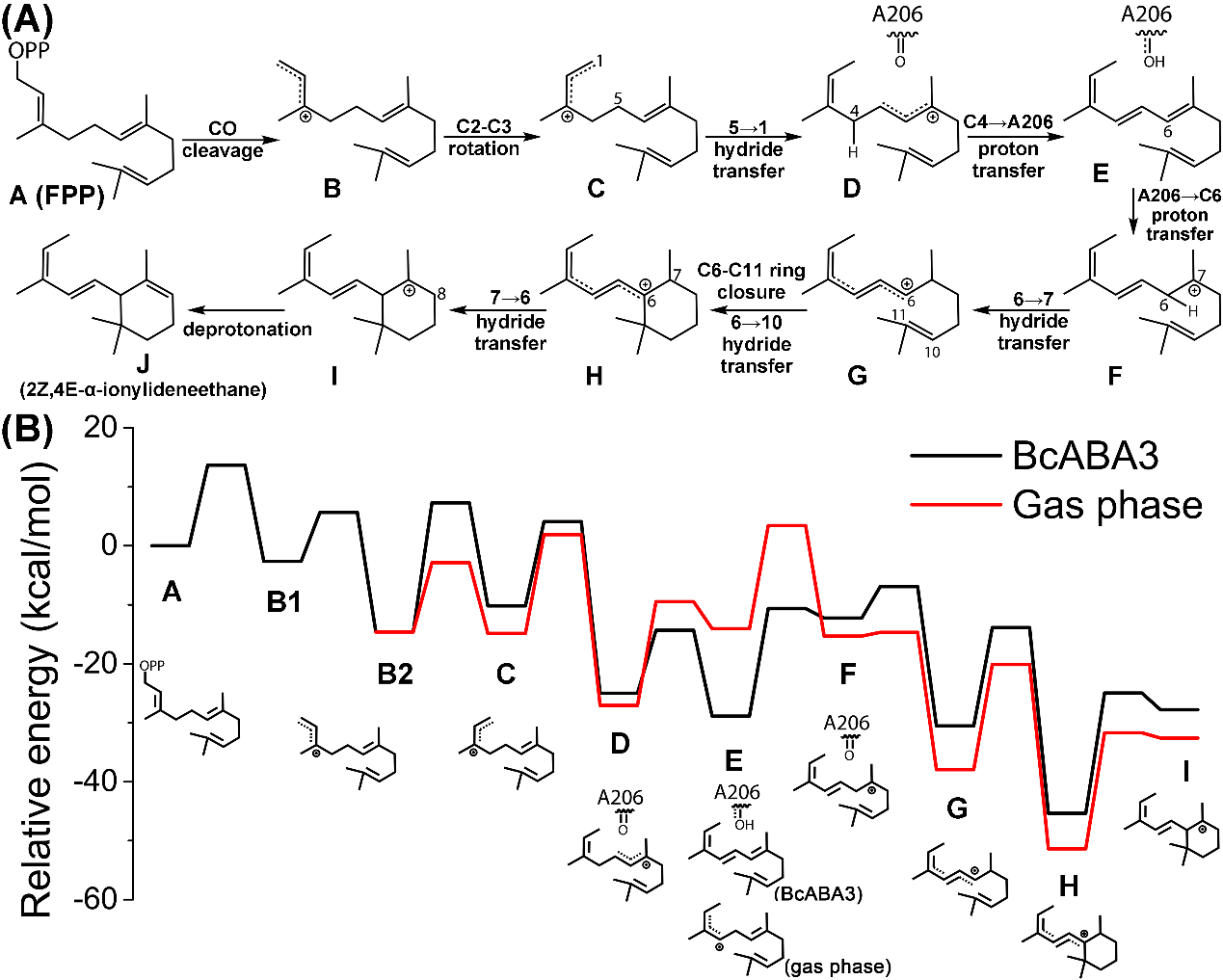 团队利用结构预测、分子对接、分子动力学模拟、量子化学簇模型等计算化学方法结合点突变实验对这一特殊的倍半萜环化酶进行了深入的研究,鉴定了它的关键残基,拟定了合理的催化机制,并比较了其与典型萜类环化酶的异同。这些结果提供了对BcABA3的分子层面的认识,为后续的蛋白质工程改造及脱落酸生物合成研究提供了丰富的信息及坚实的基础。