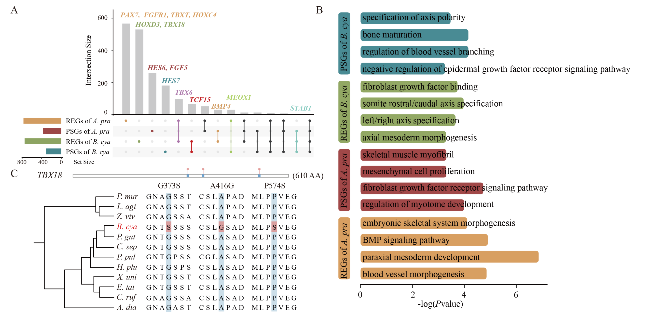 综上,本研究整合形态学、比较基因组学及功能实验验证,系统揭示了树栖蛇类尾椎延长的表型演化规律,鉴定了与该性状相关的关键基因及核心调控元件,从而在分子与调控层面阐明了其进化遗传机制。本工作不仅为理解脊椎动物体轴形态的适应性演化提供了重要案例,也为进一步探讨动物表型多样性的形成机制提供了重要科学支撑。