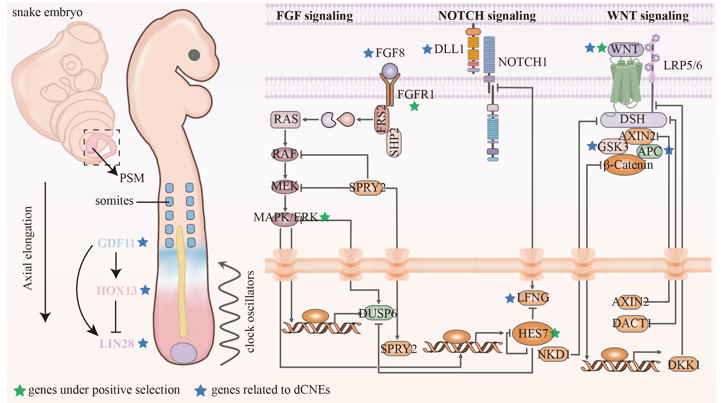 在遗传层面,研究获得了典型树栖蛇类绿林蛇(Boiga cyanea)的染色体级别基因组(图2),并结合远缘树栖蛇类绿瘦蛇(Ahaetulla prasina)的基因组进行比较分析。结果表明,在这两个独立演化出树栖习性的支系中均检测到与体节发生相关基因的加速进化信号,而体节发生过程是体轴延长的关键发育基础。进一步分析发现,核心体节发生调控因子(HES7与TBX18)受到了正选择,这些基因协同调控体节模式建立与体轴分节过程(图3)。