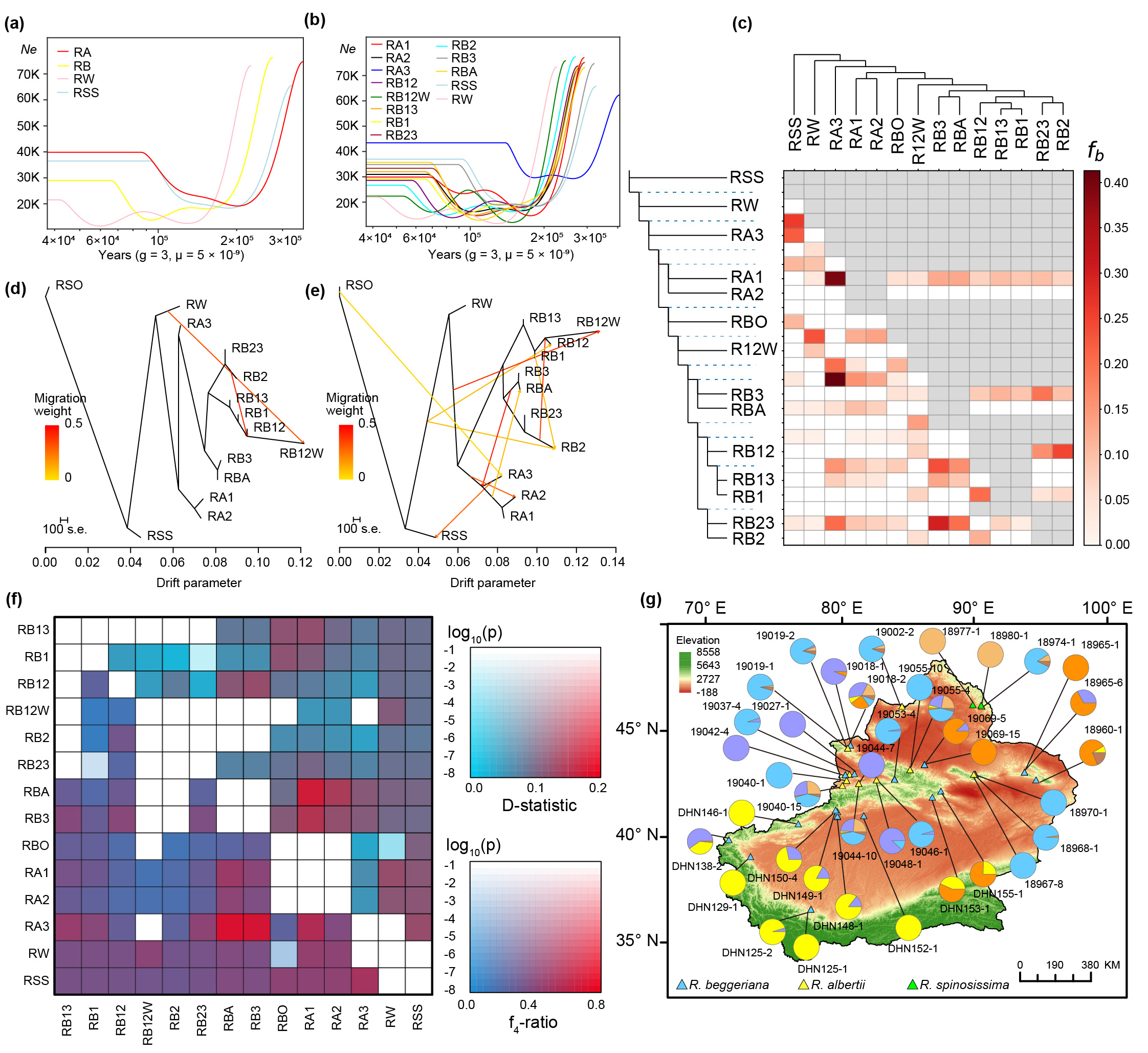 图四 二倍体种群动态、基因流与群体结构地理分布
