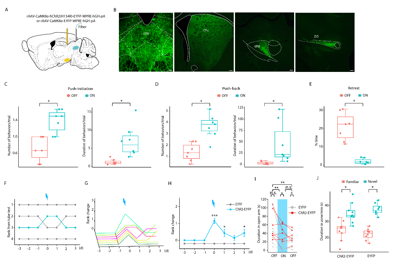 图4. 光遗传激活SNrGlu-DRN神经环路导致小鼠社会等级上升