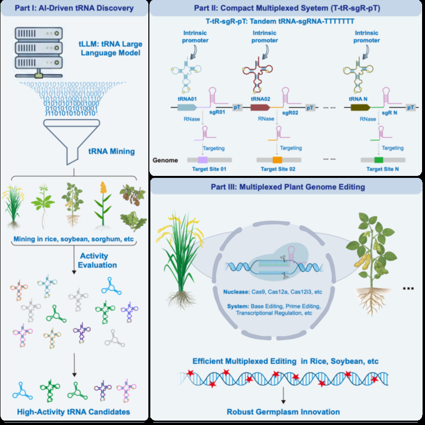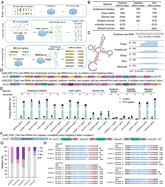 植物基因组编辑技术已成为现代生物学研究和作物改良的核心工具。然而,传统CRISPR-Cas系统依赖U3或U6启动子表达向导RNA(gRNA),在多重编辑应用中面临两大瓶颈:一是载体容量受限,难以实现高阶多重编辑;二是表达效率不一致,导致编辑效果不稳定。内源性tRNA作为Pol III启动子资源,具有启动子功能与RNA加工单元的双重优势,被视为构建紧凑型高效多重编辑系统的理想选择。然而,全球范围内缺乏系统性的功能性tRNA挖掘方法,尤其是难以识别结构变异较大的非典型tRNA,这限制了其在植物基因组编辑中的广泛应用。