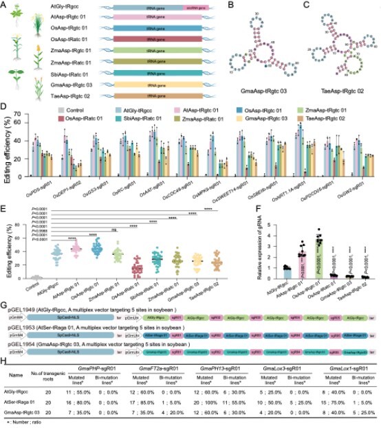 图2 不同植物来源的tRNA在水稻和大豆sgRNA加工和基因组编辑中的比较