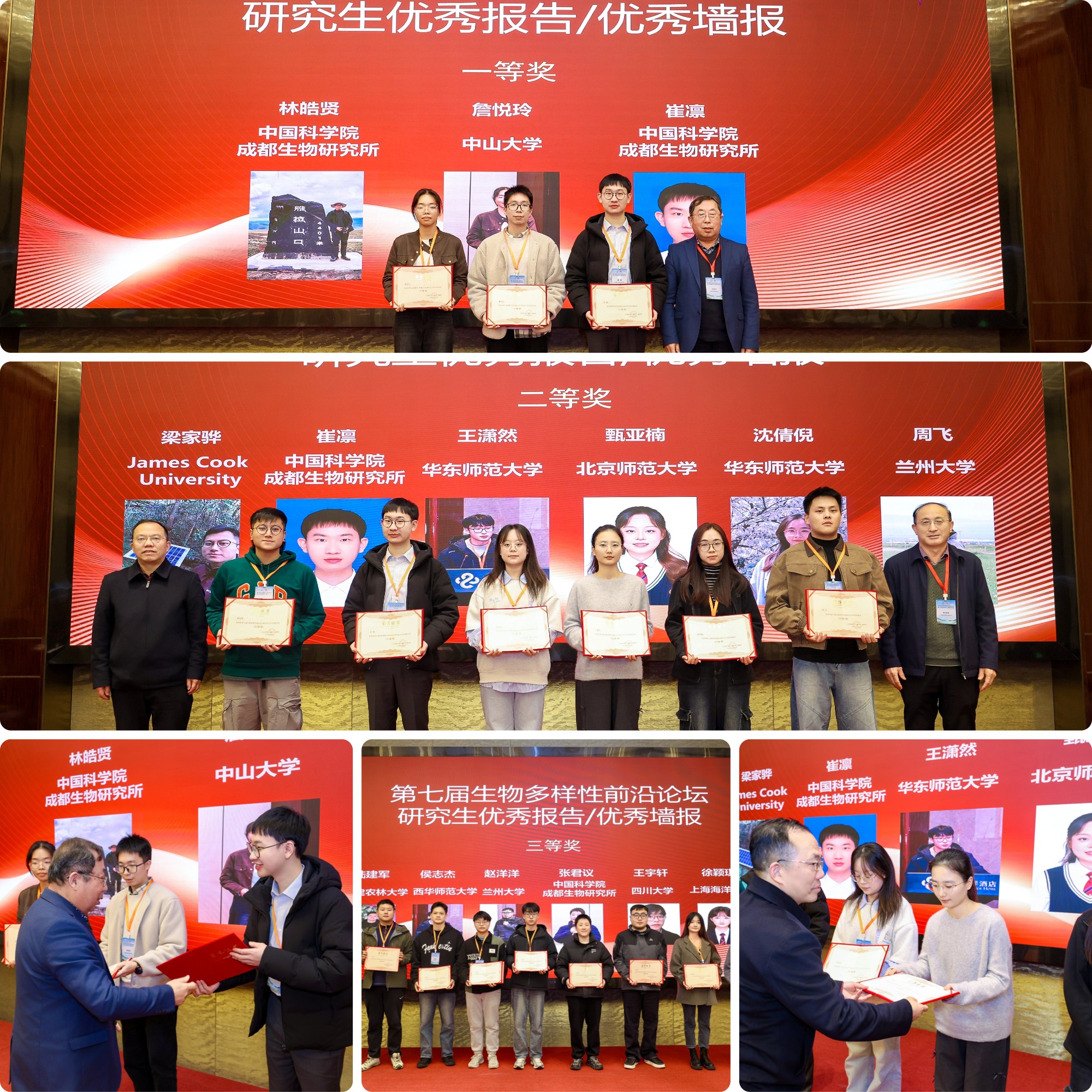 为发掘科研后备力量,激发青年学子的创新活力,本次会议专门设置了研究生论坛。来自四川大学、北京师范大学、西交利物浦大学、复旦大学、中山大学等单位的优秀研究生展示了其在动物分类进化、保护生物学、植物学及环境修复等方向的创新研究。评审小组由《生物多样性》期刊副主编、编委及青年编委组成,对学子们的科学问题挖掘与表达能力给予了高度评价。闭幕式上,马克平院士、雷富民研究员、黄晓磊教授、江建平研究员和胡军华研究员为优秀报告和优秀墙报获得者颁发了证书,鼓励这批科研“生力军”在未来继续探索生命科学的奥秘。