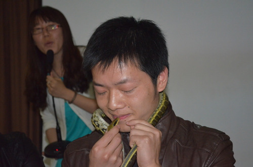 两爬室丁利博士围绕大家对蛇类认识上的误区, 用幽默生动的语言进行了讲解。在协会的组织下,现场还开展了惊险刺激的“与活蛇亲密接触”闯关游戏,参会人员高涨的热情给活动现场带来一阵阵掌声。