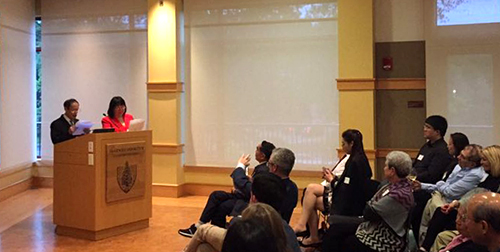 5月22号,主办方邀请了包括州议员、哈佛大学研究生院院长在内的70多位专家和社会名流以及中国留学生代表参加了“威尔逊研究”交流会,并举办了“重走威尔逊之路”摄影展。华盛顿史密森学会文军教授和生物所印开蒲研究员分别作了“中国和北美地区的植物多样性的比较研究” 和“重走威尔逊之路”的两个主题报告,会上还播放了由央视拍摄的纪录片《中国威尔逊》第三集。报告和纪录片引起在场观众强烈反响,不时响起热烈地掌声。